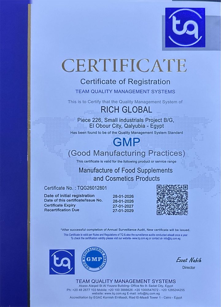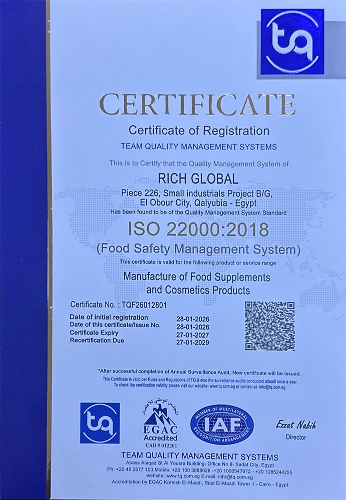 8 - في أكتوبر عام 2018 تم تأسیس مصنع ريتش جلوبال وضمه إلي المجموعة لیصبح ھو المسئول عن تصنیع وتعبئة المنتجات الحاملة لعلامة يوني سمارت جروب وضمه إلي المجموعة وحصولة علي أيزو 9001 و 2200 و GMP