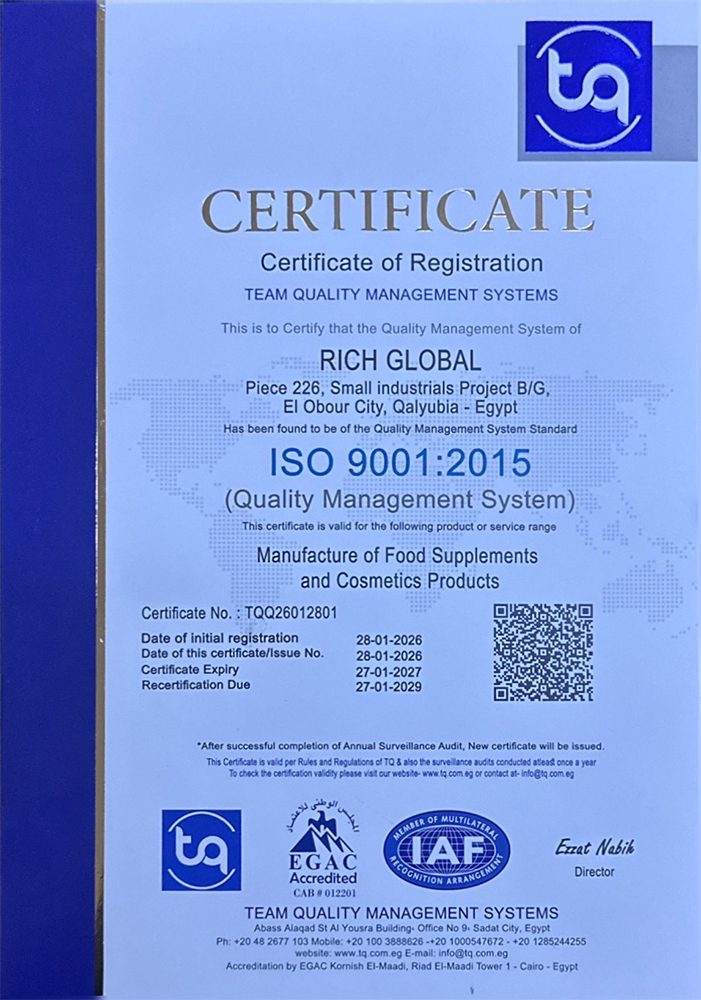 8. Octobre 2018 marque la création de Rich Global Factory, dédiée à la fabrication et au conditionnement des produits Unismart Group, certifiée ISO 9001, 2200 et GMP.